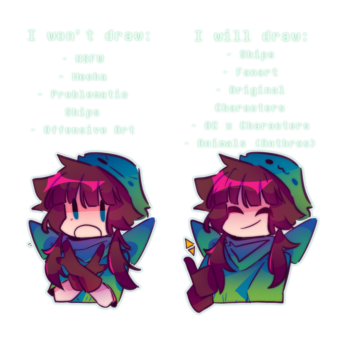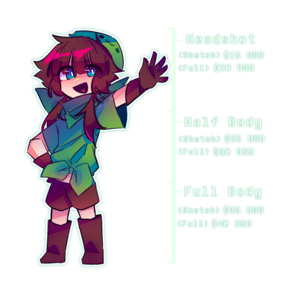 E X T R A — D E T A I L S- When commissioning me, you will be paying me via PayPal (with USD payment), as it is my only payment method right now.- Your commission should be done within a week or two (you will be put into a waiting list of some sorts. If you ordered early, your commission will be of top priority.)- During the process of making your commission, I will be sending you a sketch (the number of sketches may vary; each sketch is an alteration of a certain pose; facial expression; etc.) At this time, please pick a sketch you want the final piece to be. You cannot change this once the official drawing process begins.- Payment goes as this: after sending you a sketch of your commission, you will pay half of the total payment. Once I send you your finished commission, you will pay the other half of your total payment.━━━━━━━━━━━━━━━━━━━P E R M I S S I O N S- You can pretty much do almost everything with your commission: share it with friends; print it out; post it; make it your pfp/banner; etc.- CREDIT IS MANDATORY IF YOU WANT TO SHARE YOUR COMMISSION ONLINE!!- Do not profit off of your commission: this means no reselling, or making merchandise off of your commission.